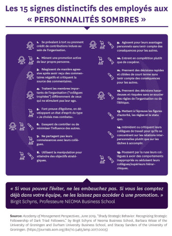 “Ces trois types de personnalités, collectivement appelées “la Triade Sombre” peuvent être animées de mauvais sentiments, d’un manque de compassion pour les autres et usent de leur position de “suiveur/collaborateur” pour poursuivre leur propres buts”, décrivent les auteurs.