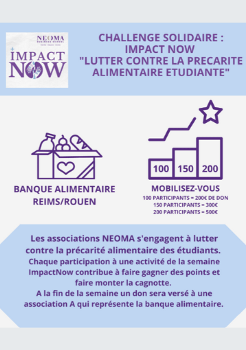 Pour la 2e édition d’Impact Now sur les campus de NEOMA, les étudiants ont participé à un challenge solidaire visant à lutter contre la précarité alimentaire étudiante. Concrètement, chaque participation étudiante à une activité de la semaine donnait des points et contribuait à faire grimper une cagnotte.