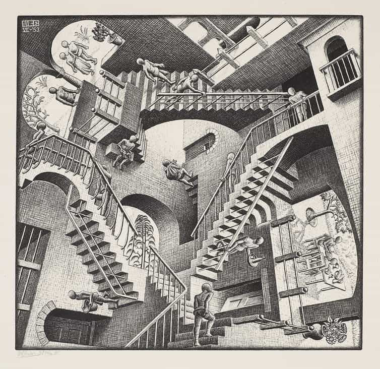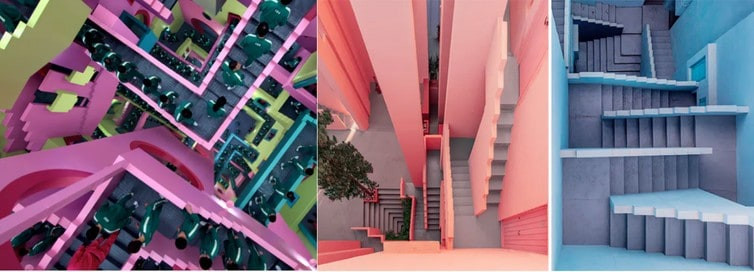 Autre espace impressionnant, le grand hall rempli d’escaliers multicolores superposés qui connectent le dortoir des joueurs avec les espaces de jeu. Cet imbroglio de marches, de portes et de fenêtres trouve son inspiration dans deux principales œuvres : La Muralla Roja de Ricardo Boffil et Relativité de M. C. Escher. Dans ce dédale, les joueurs apparaissent désorientés et piégés, minuscules et insignifiants comme les pions d’un jeu. Les autres décors tout aussi travaillés ne seront pas décrits pour ne pas "divulgâcher" la série.