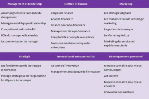 A noter : Vous avez la possibilité de réaliser ces « objectifs de compétences » à l’unité. La validation des 4 blocs aboutit à l’obtention du titre de Cadre dirigeant. Chacun des blocs de compétences est certifié RNCP.